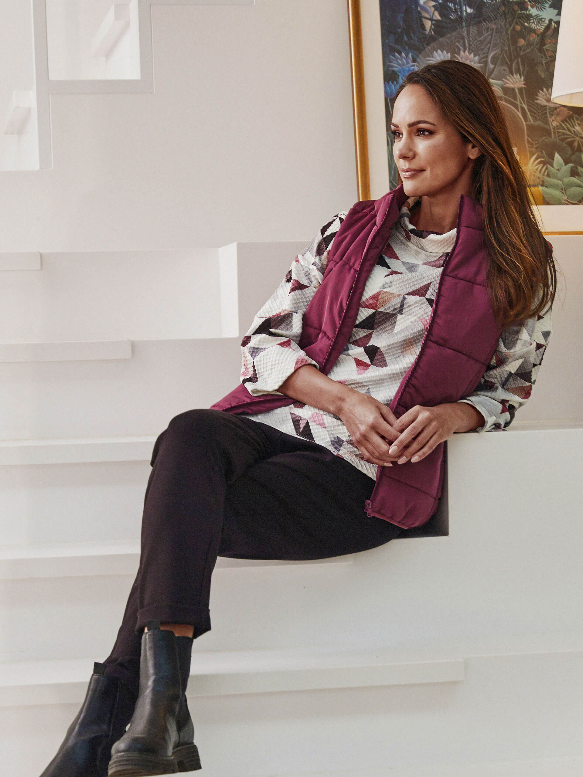 Dieses Outfit steht für modernen Komfort mit stilvoller Zurückhaltung und eignet sich ideal für Alltag und Freizeit. Die ärmellose Steppweste in tiefem Beerenton setzt einen modischen Akzent und bietet angenehme Wärme, ohne aufzutragen. Durch den geraden Schnitt lässt sie sich vielseitig kombinieren und sorgt für eine ausgewogene Silhouette. Darunter getragen wird ein langärmliges Oberteil mit grafischem Muster in harmonischen Natur- und Beerentönen, das dem Look Struktur und eine dezente Dynamik verleiht. Der lockere Schnitt und das angenehm weiche Material sorgen für hohen Tragekomfort über den ganzen Tag. Die schlichte schwarze Hose ergänzt das Outfit mit einer zeitlosen, zurückhaltenden Optik und unterstreicht den lässig-eleganten Charakter. Abgerundet wird der Look durch schwarze Stiefeletten, die dem Ensemble eine moderne, urbane Note verleihen. Insgesamt entsteht ein gepflegter, vielseitiger Look, der sich mühelos in unterschiedliche Alltagssituationen integrieren lässt und Komfort mit zeitgemäßem Stil verbindet.