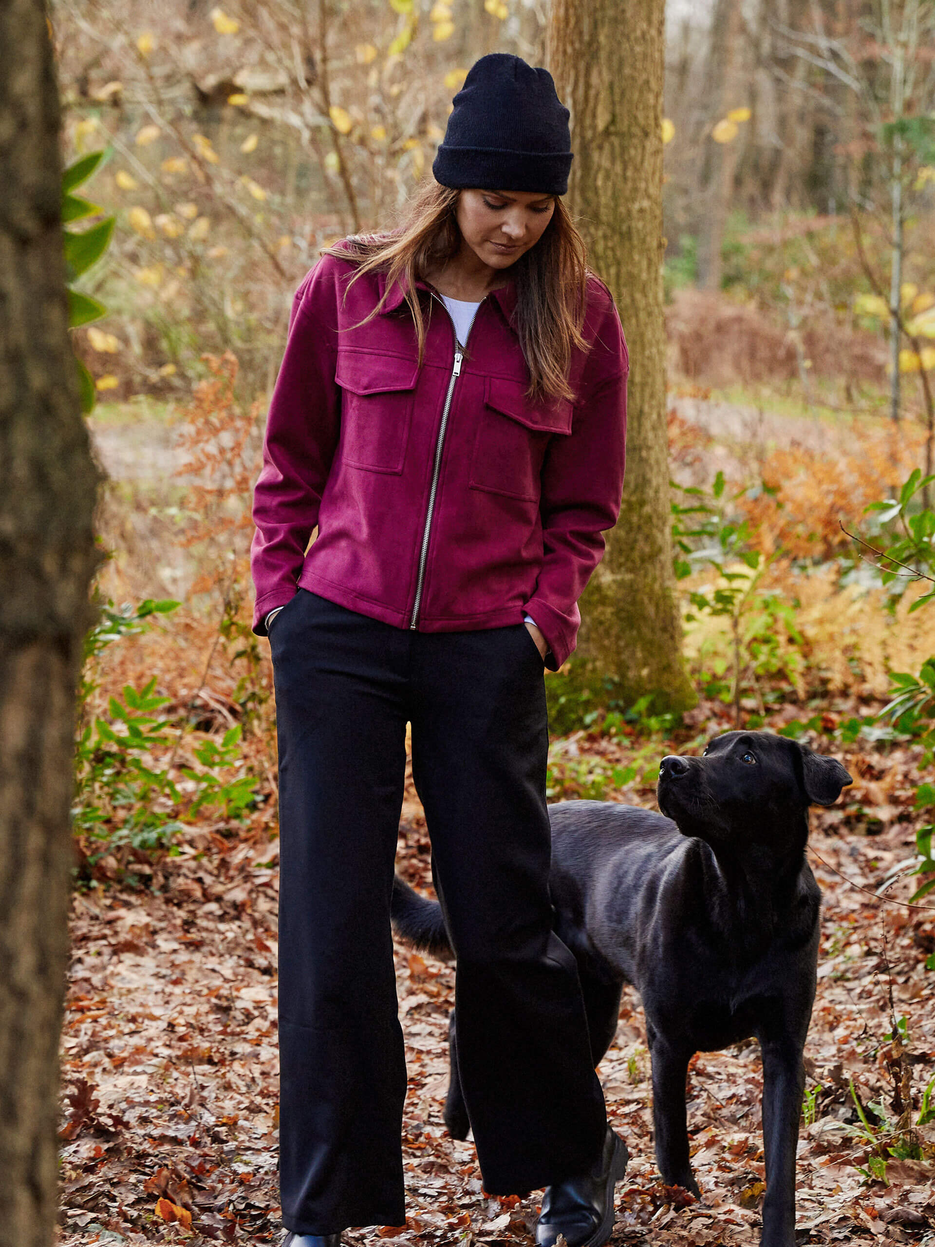 Dieses Outfit steht für funktionalen Casual-Style mit klarer Linienführung und eignet sich ideal für aktive Tage in der Übergangszeit. Die Jacke in kräftigem Beerenton überzeugt durch ihr schlichtes, modernes Design und eine angenehm strukturierte Oberfläche. Der durchgehende Reißverschluss sowie die aufgesetzten Brusttaschen verleihen dem Modell eine sportive, zeitlose Optik und sorgen gleichzeitig für Alltagstauglichkeit. Der gerade Schnitt bietet hohen Tragekomfort und ausreichend Bewegungsfreiheit. Kombiniert wird die Jacke mit einer schlichten, dunklen Stoffhose mit lockerem Beinverlauf, die dem Look Ruhe und eine ausgewogene Silhouette verleiht. Insgesamt entsteht ein unkomplizierter, moderner Look, der sich ideal für Spaziergänge, Freizeitaktivitäten und den Alltag eignet und Komfort mit zeitgemäßem Stil verbindet.